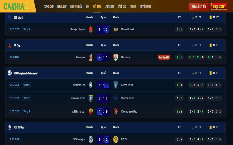 Với tốc độ cập nhật nhanh, dữ liệu đầy đủ và độ chính xác cao, Cakhia Live đang dần trở thành điểm đến quen thuộc của đông đảo người hâm mộ bóng đá. Dù bạn quan tâm đến Ngoại hạng Anh, Serie A, La Liga hay Bundesliga, nền tảng này đều mang đến trải nghiệm tra cứu kết quả thuận tiện, liền mạch và đáng tin cậy.